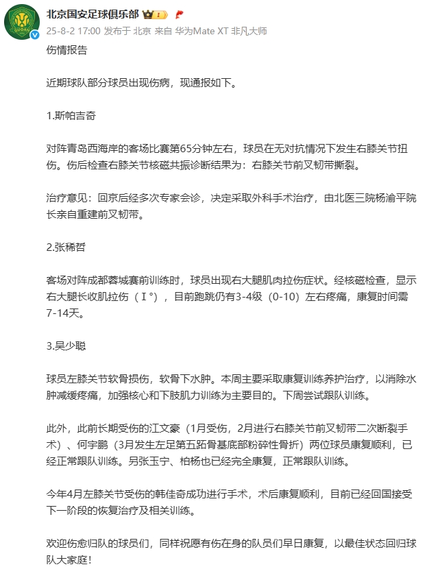 08月02日讯 国安官方发布伤情公告,球队外援斯帕吉奇右膝前叉韧带撕裂,将接受前叉韧带重建。除此以外,张稀哲右大腿肌肉拉伤将缺阵2周,吴少聪左膝关节软骨损伤下周跟队训练。
