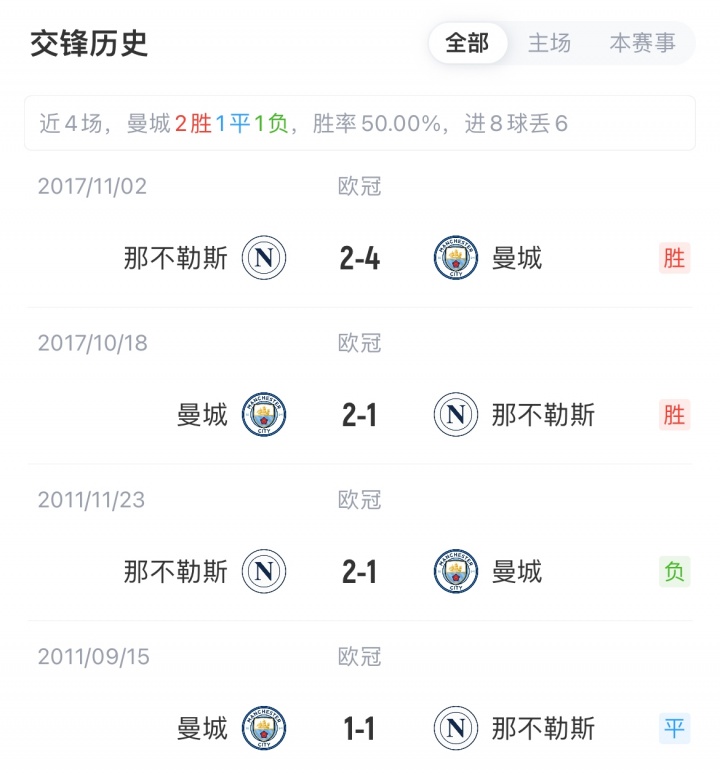 曼城开季联赛2胜2负积6分暂位英超第8,上一场主场3-0战胜曼联;那不勒斯开季3战全胜积9分,暂位意甲榜首。双方交锋曼城已取得两连胜。