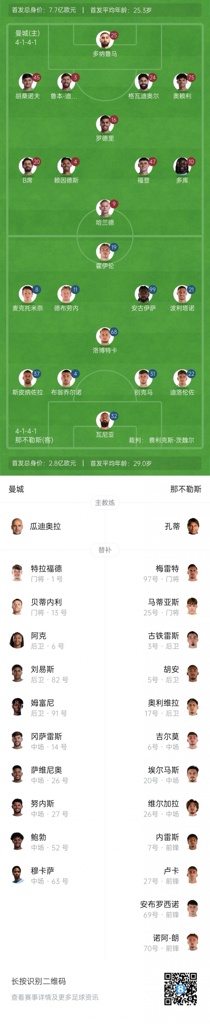 那不勒斯首发:32-瓦尼亚、4-布翁乔尔诺、37-斯皮纳佐拉、31-别克马、22-迪洛伦佐、68-洛博特卡、8-麦克托米奈、11-德布劳内、99-安古伊萨、21-波利塔诺、19-霍伊伦