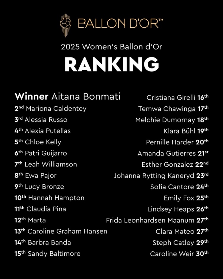2025年女足金球奖前十:邦马蒂第一,卡尔登泰第二,鲁索第三