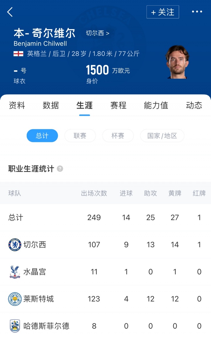奇尔维尔时年28岁,英格兰后卫。上赛季他被切尔西租借至水晶宫,为水晶宫出场12次,取得1粒进球。目前其德转身价为1500万欧。
